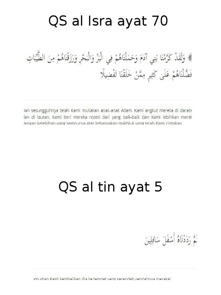 Walaqad karramna banee adama wahamalnahum fee albarri waalbahri warazaqnahum mina alttayyibati wafaddalnahum aaala katheerin mimman khalaqna tafdeelan. Terjemah surat al isra ayat 70 77. Ayat ini terdapat dalam surah al israa. Quran surat al isra ayat 70.
