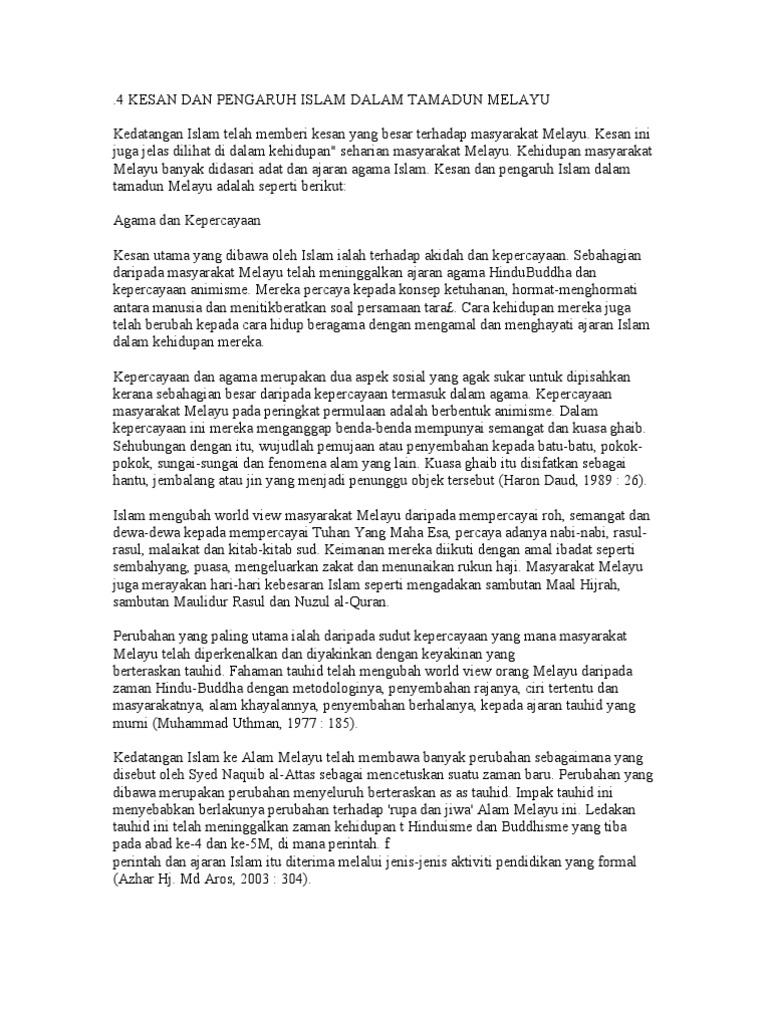 Tamadun islam banyak memberi pengaruh kepada tamadun melayu. Islam adalah agama universal yang datang dari allah swt untuk semua manusia. Islam jugamempengaruhi lapangan budaya material dan ekspresif orang orang melayu. Proses penyerapan islam ini berlaku secara berperingkat peringkat di kalangan masyarakat melayu yang bermula daripada golongan istana pembesar sehinggalah kepada rakyat biasa. Tamadun islam banyak memberi pengaruh kepada tamadun melayu that s why by remmy on 17 10 2017 in general malay malaysia melayu oum 0 comments kesan kedatangan islam ke dunia melayu boleh dilihat dari pelbagai aspek kehidupan masyarakat melayu sehingga kini.