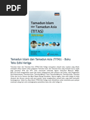 Buku ini masih mengekalkan enam bab utama sebagaimana edisi pertama dan kedua iaitu pengenalan ilmu ketamadunan. Academia edu is a platform for academics to share research papers. Tamadun islam dan tamadun asia titas edisi ketiga merupakan sebuah buku rujukan yang ditulis menepati silibus terkini untuk pengajian tamadun islam dan tamadun asia yang menjadi kursus wajib bagi penuntut ipta dan ipts serta memenuhi kehendak agensi kelayakan malaysia mqa. Tamadun islam dan tamadun asia titas edisi ketiga merupakan sebuah buku rujukan yang ditulis menepati silibus terkini untuk pengajian tamadun islam dan tamadun asia yang menjadi kursus wajib bagi penuntut ipta dan ipts serta memenuhi kehendak agensi kelayakan malaysia mqa.