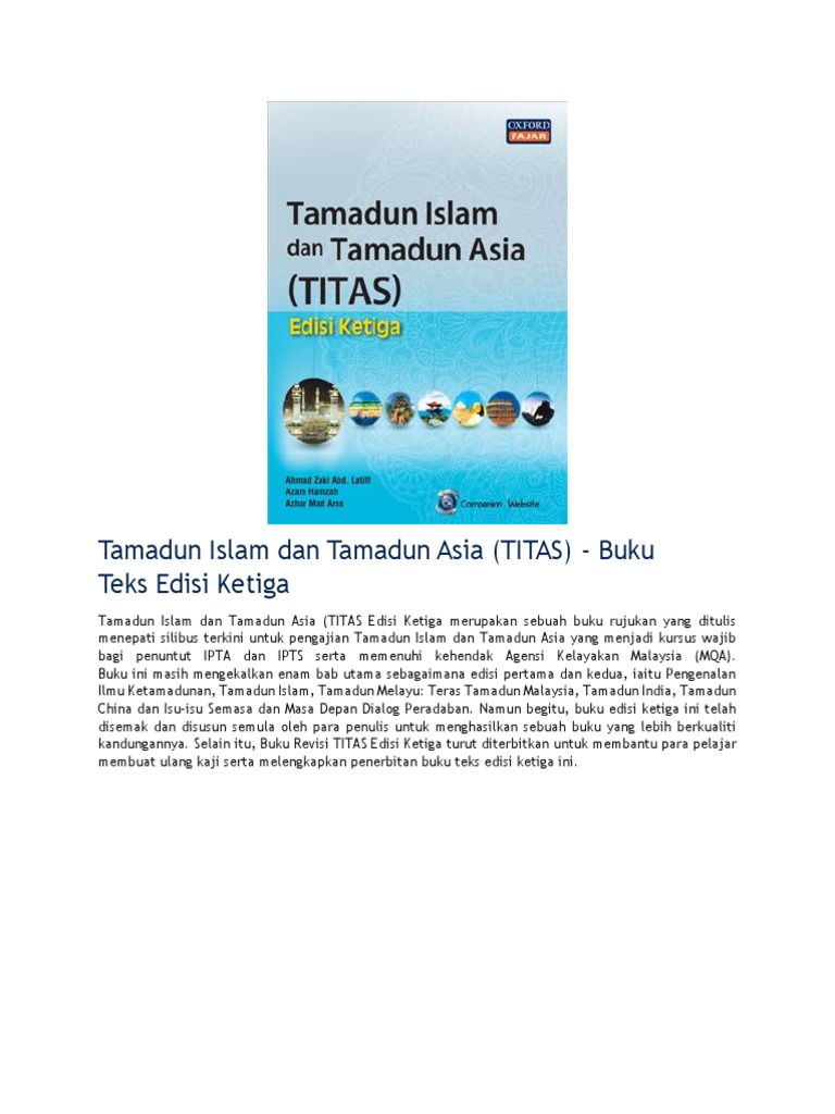 Tamadun islam dan tamadun asia titas buku teks edisi ketiga tamadun islam dan tamadun asia titas edisi ketiga merupakan sebuah buku rujukan yang ditulis menepati silibus terkini untuk pengajian tamadun islam dan tamadun asia yang menjadi kursus wajib bagi penuntut ipta dan ipts serta memenuhi kehendak agensi kelayakan malaysia mqa.