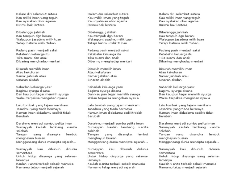 Jasadmu yang tiada bermaya namun iman di dadamu sedikit tidak berubah. Sumayyah kau dibunuh di dunia sementara untuk hidup di syurga yang selama lamanya. Walaupun bersifat lemah lembut dan keibuan wanita mampu menyumbangkan tenaga dan idea untuk membangunkan negara. Tangan yang disangka lembut menghayun buaian mengoncang dunia mencipta sejarah sumaiyah kau dibunuh didunia sementara untuk hidup disyurga yang selama lamanya kaulah wanita terbaik sebaik manusia namamu tetap menjadi sejarah.