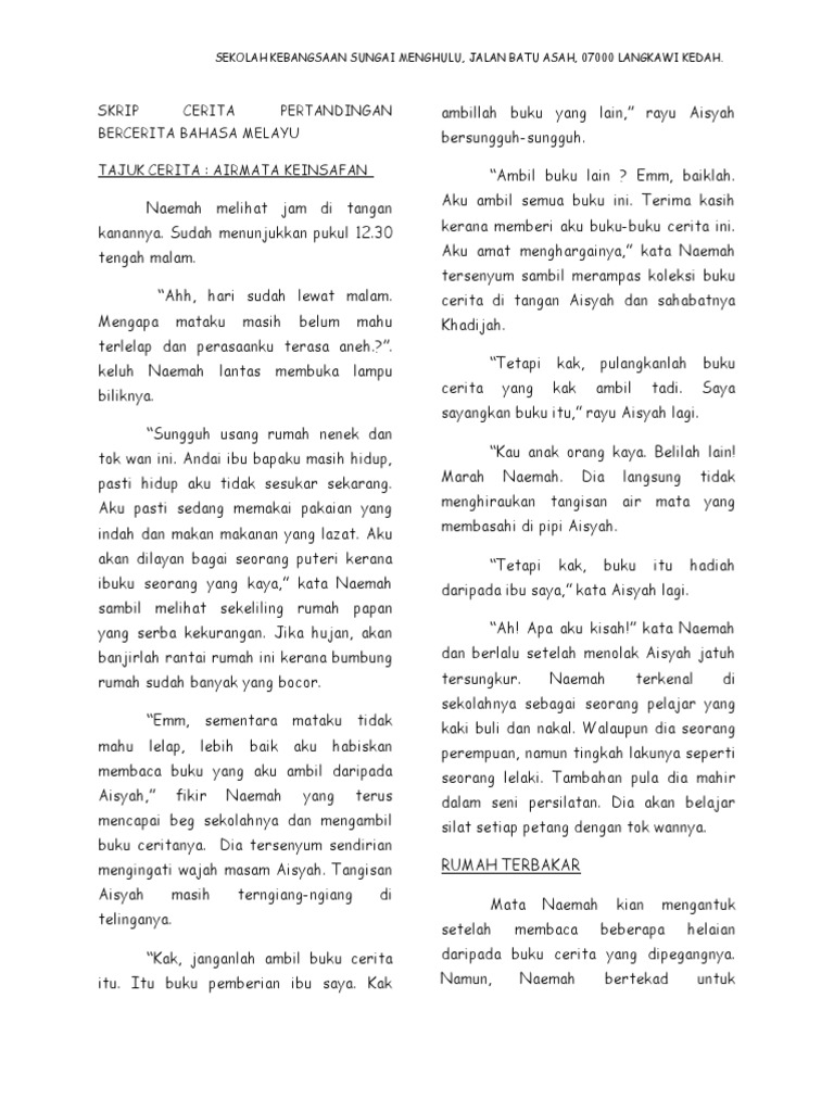 Teks cerita teladan bahasa melayu. Posted by unknown on 8 28 ptg. Teks cerita 2 pertandingan. Skrip cerita pertandingan bercerita bahasa melayu 1. Ahh hari sudah lewat malam.