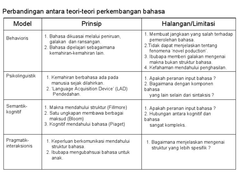 Tanpa bahasa seseorang tidak akan dapat berkomunikasi dengan orang lain. Pdf banyak kajian luar negara yang telah dijalankan bagi mengukur tahap perkembangan bahasa kanak kanak berbanding di malaysia. Teori perkembangan bahasa anak usia dini paud menurut para ahli kita semua menyadari bahwa bahasa merupakan suatu hal yang penting. Teori teori yang dikemukakan akan.