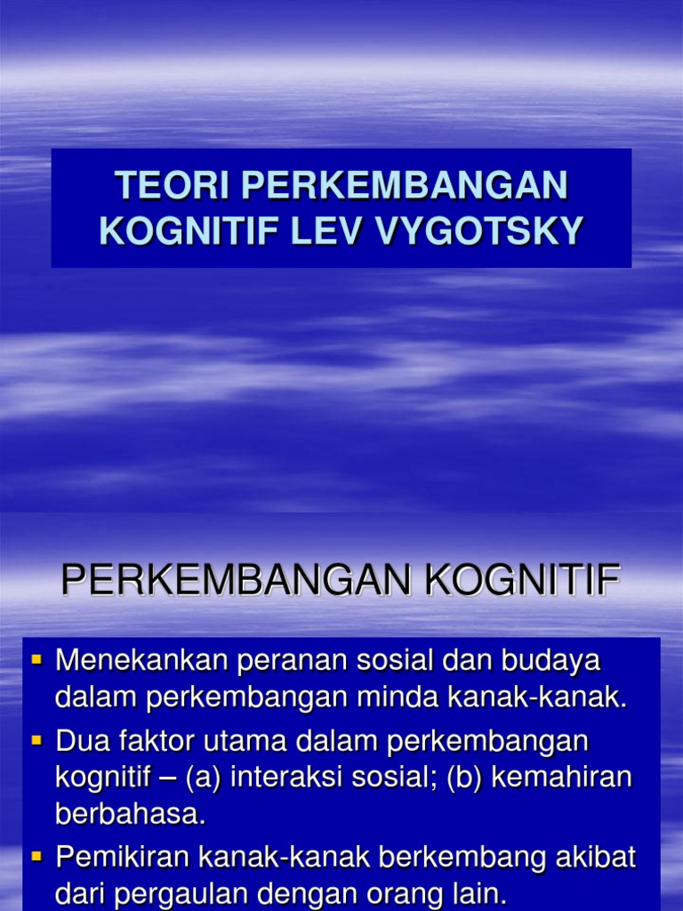 Lev vygotsky 1896 1934 berpendapat bahwa perkembangan kognitif dan bahasa anak anak tidak berkembang dalam suatu situasi sosial yang hampa. Anak berkembangberkembang melalui melalui inderaindera dandan. Teori perkembangan kognitif menurut vygotsky vygotsky berpendapat bahwa bermain mempunyai peran langsung terhadap perkembangan kognitif seorang anak. Teori kognitif lev vygotsky 1.