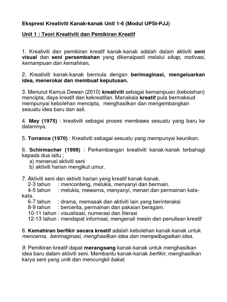 Teori perkembangan kreativiti kanak kanak. Pada peringkat awal kanak kanak sentiasa melintasi sempadan sempadan norma ketika asyik bermain atau apabila tekun melakukan sesuatu aktiviti. Teori kecerdasan pelbagai dan perkembangan kreativiti kanak kanak gardner 1993 menganggap semua kanak kanak berpotensi berfikir secara kreatif. Kreativiti adalah terbuka segar baru original tersendiri unik dan merupakan naluri semulajadi kanak kanak. Perkembangan kreativiti kanak kanak definasi kreativiti walaupun pada amnya perkataan kreativiti biasa dikaitkan dengan bidang seni ia digunakan dalam berbagai cara dalam berbagai konteks.