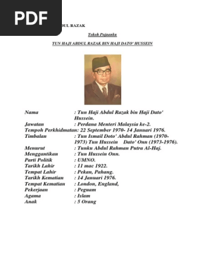 Tun abdul razak bin hussein biodata. Tun haji abdul razak bin dato hussein 11 mac 1922 14 januari 1976 merupakan perdana menteri malaysia kedua yang berkhidmat dari tahun 1970 sehingga 1976. Tun haji abdul razak bin hussein prime minister foreign minister and defense minister of malaysia from 1970 to 1976. Allahyaraham tun abdul razak dato hussein meninggal dunia pada 14 januari 1976 di london kerana penyakit leukemia dan digantikan oleh allahyaraham tun hussein bin dato onn. Untuk lebih banyak maklumat support kami dengan klik like dibawah.