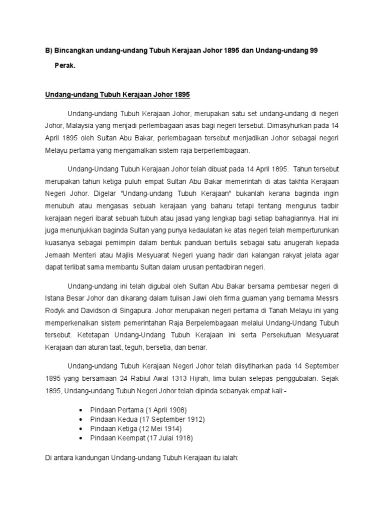 Sekian terima kasih aspek pendidikan sebagai langkah meningkatkan taraf dan kualiti hidup rakyat samb melalui pelaksanaan undang undang tubuh kerajaan johor pendidikan dalam bahasa melayu bahasa inggeris dan agama islam disepadukan sekolah teknik johor telah ditubuhkan. Undang undang tubuh kerajaan negeri johor 16. Dimasyhurkan pada 14 april 1895 oleh sultan abu bakar perlembagaan tersebut menjadikan johor sebagai negeri melayu pertama yang mengamalkan sistem raja berperlembagaan. Teks asal undang undang tubuh 1895 hingga 1908 adalah ditulis dalam tulisan jawi.