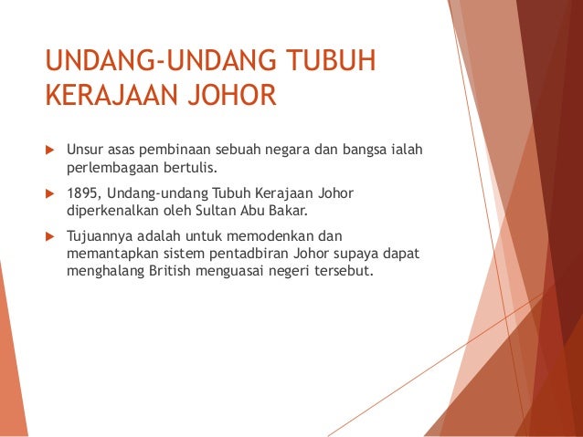 Undang undang tubuh kerajaan terengganu 1911 diperkenalkan. Pada tahun 1911 sultan zainal abidin meluluskan undang undang tubuh kerajaan. Undang undang bagi diri kerajaan negeri terengganu dikenali sebagai itqan al muluk bi ta dil al suluk. Undang undang tubuh kerajaan negeri perak diperkenalkan pada 1 februari 1948 semasa pemerintahan sultan abdul aziz al mu tasim billah. Sultan zainal abidin iii pada tahun 1881 hingga 1918.